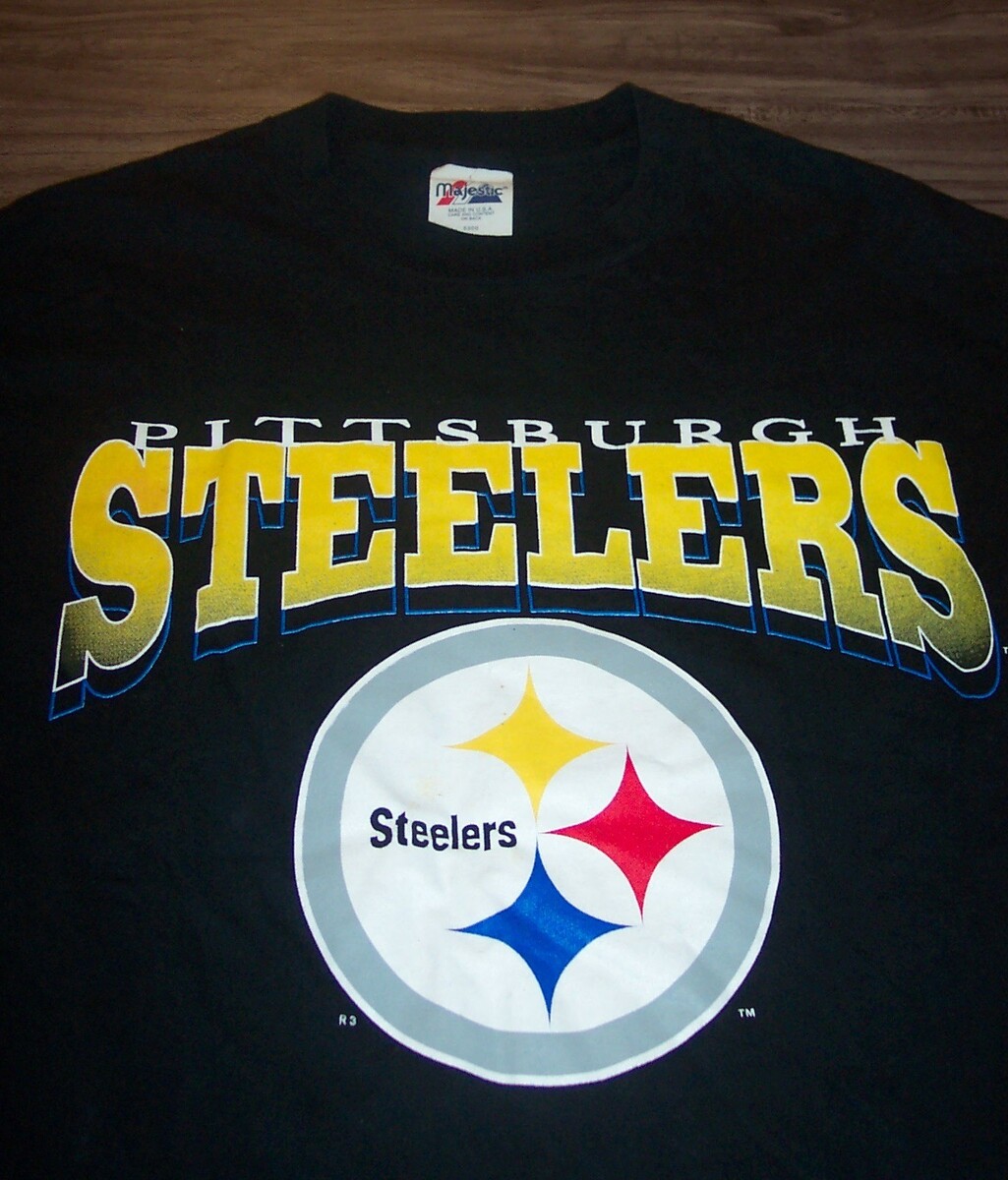 This is a Vintage PITTSBURGH STEELERS NFL FOOTBALL T-Shirt. It is a size MENS LARGE. It is 21 inches from armpit to armpit and 31 inches in length. It is in great condition. It is CLEAN! No Stains, Tears or Defects. Officially Licensed by MAJESTIC. Made in the USA. 100% Cotton. Combine auctions to save on shipping. ELAG