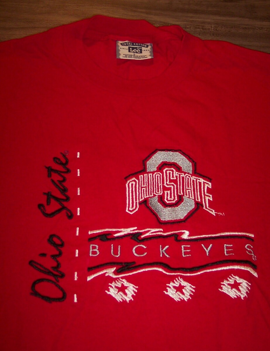 This is a VINTAGE OHIO STATE UNIVERSITY Buckeyes Embroidered T-shirt. It is a Size LARGE LEE Total Cotton Shirt. It is 22 inches from armpit to armpit and 29 inches in length. It is in Great condition. It is CLEAN! No Stains, Tears, or Defects. It is 100% Cotton. Very Nice Vintage Embroidered Shirt. Combine auctions to save on shipping. ELAG