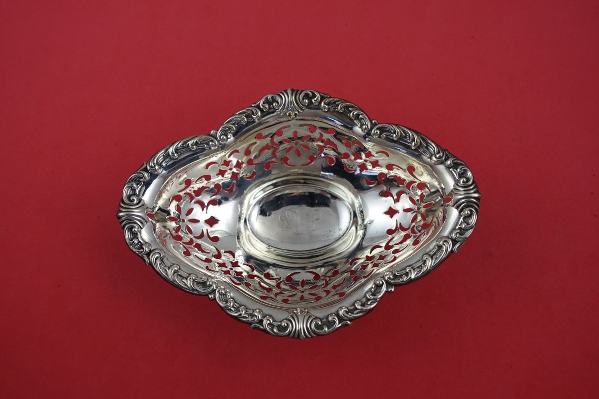 Terrific Strasbourg by Gorham sterling silver Nut Dish marked #A1512 Master pierced footed dated 1901. This dish measures 5 1/2" x 4" and weighs 2 ounces. It is not monogrammed and is in good vintage condition. Excellent piece!