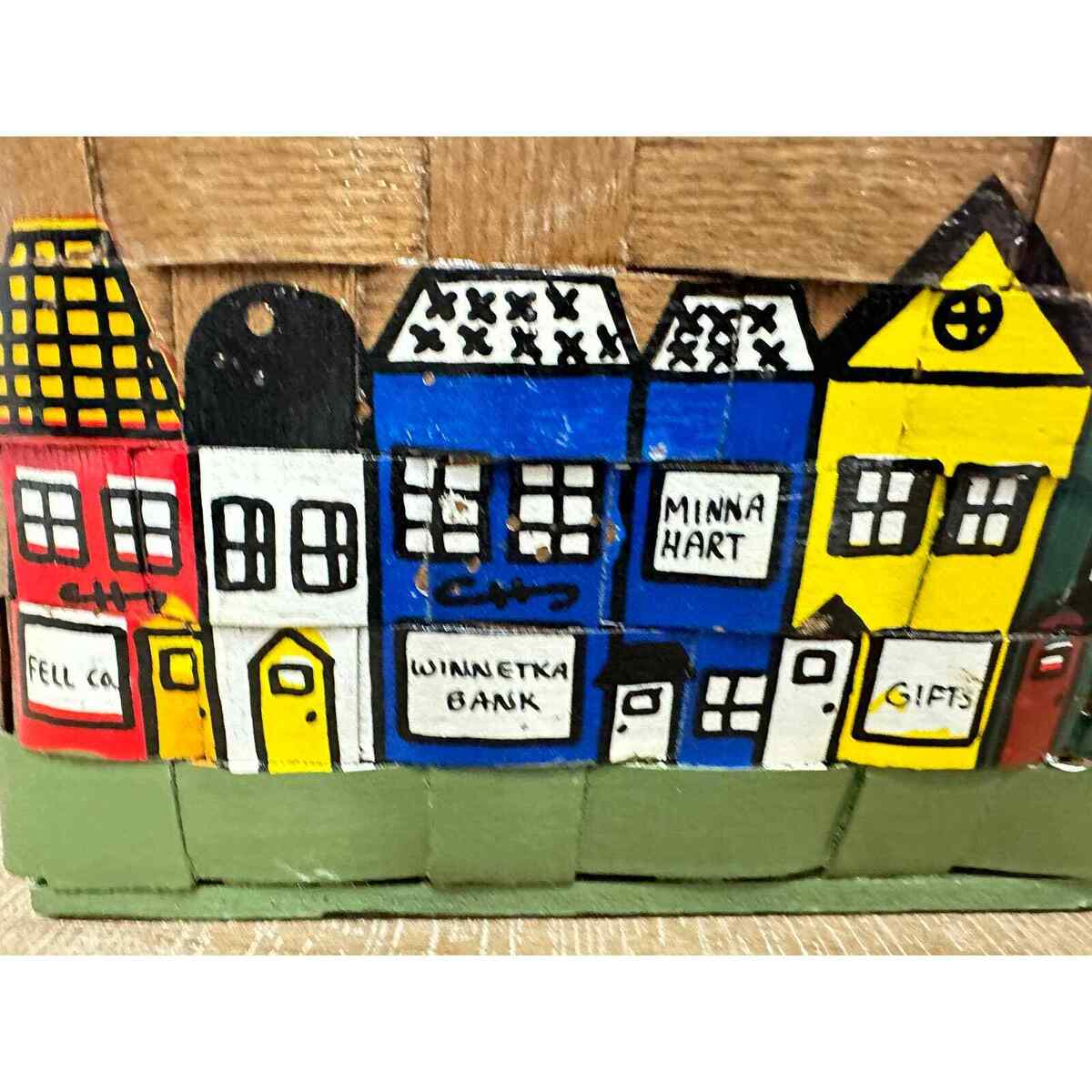 Adorable Vintage Signed Caro Nan Woven wooden Basket Purse with an "Elegance" theme, and the name Minna Hart, a store in Illinois. Colorful storefronts including the Minna Hart store. Yellow Floral Quilted Interior. Very good condition, clean.but I think may be missing the penny, if it was there, on the top.