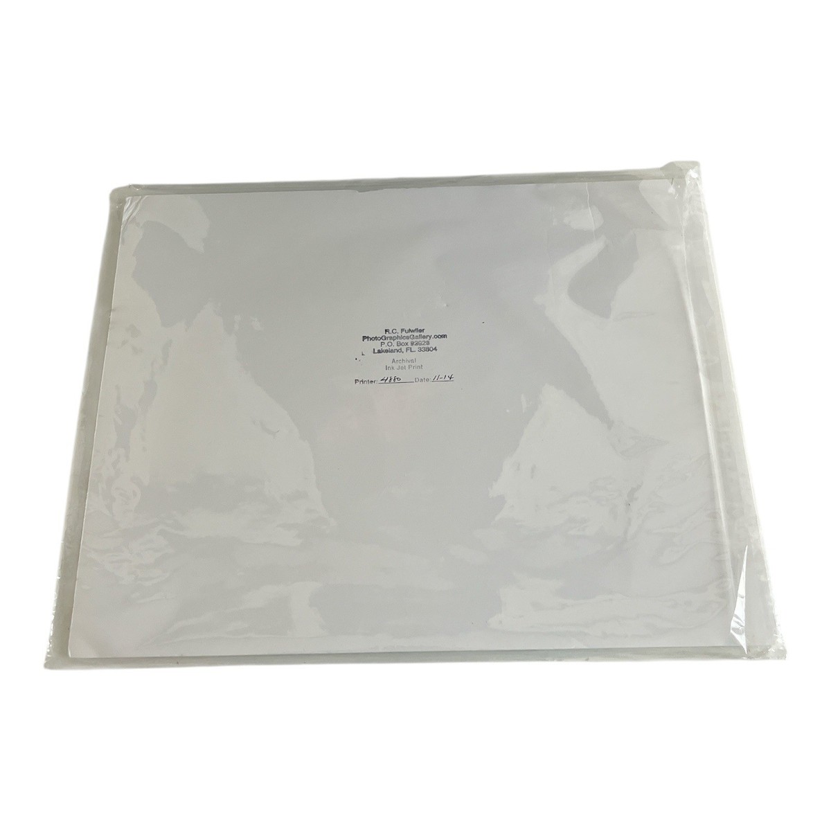 Good condition. Print and mat are clean with light waviness and mild surface wear from storage. Noticeable creasing and damage to the mat at the **bottom edge** and **top right corner**. Plastic sleeve also shows some wear.