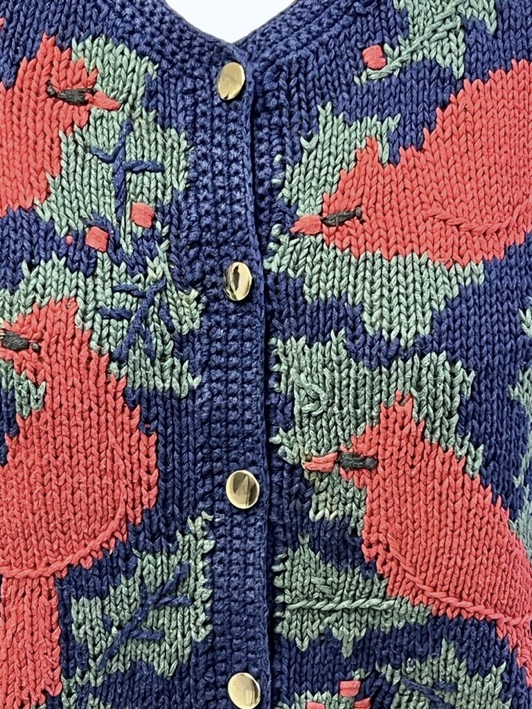 Vintage Orvis Hand Knit Cardigan Sweater Womens LARGE Cardinal Bird Holly