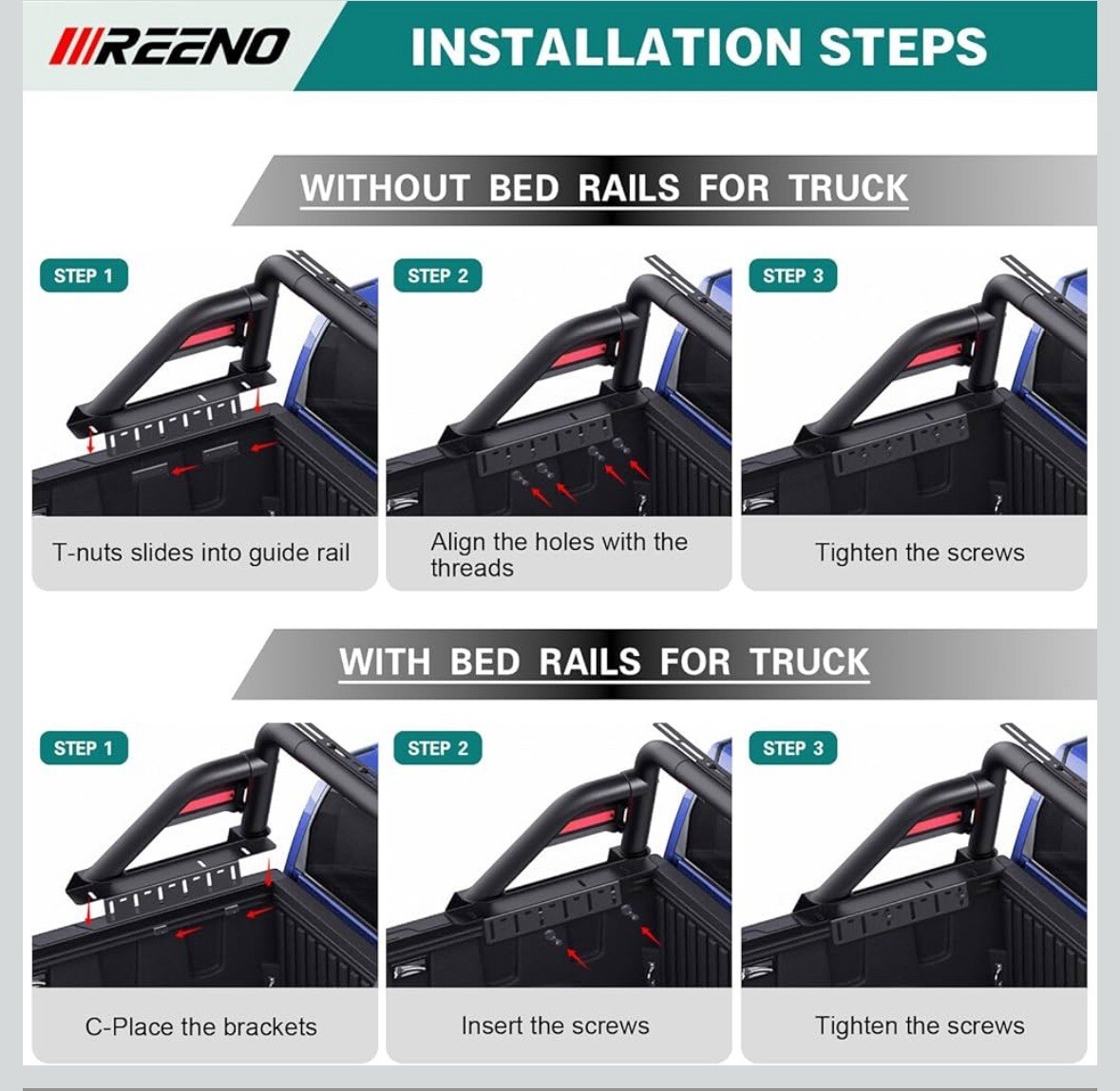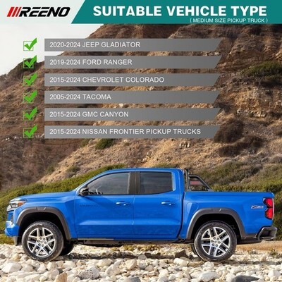 Compatible with multiple OEM and aftermarket truck bed systems. Reeno part reference: universal mid-size bed roll bar kit.