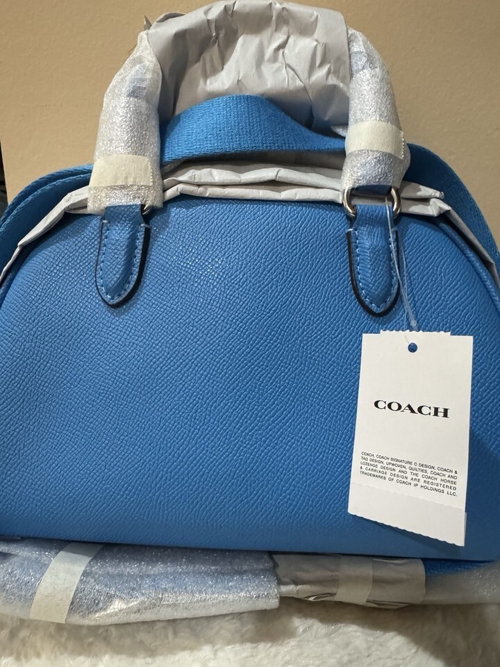 The Coach Small Leather Crossbody Shoulder Bag is a stylish and practical accessory for women on-the-go. Made from high-quality leather with a solid blue exterior color, this rectangular-shaped bag features a zip closure and a crossbody strap handle style. The silver hardware accents add a touch of elegance, while the fabric lining provides durability. Perfect for carrying essentials while keeping your hands free, this designer bag also includes a charming accessory like a bag charm. The Coach brand ensures both quality craftsmanship and a fashionable style that is ideal for everyday use.