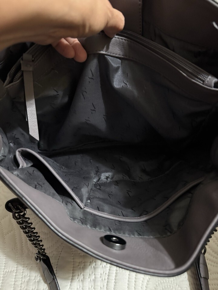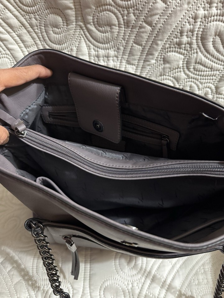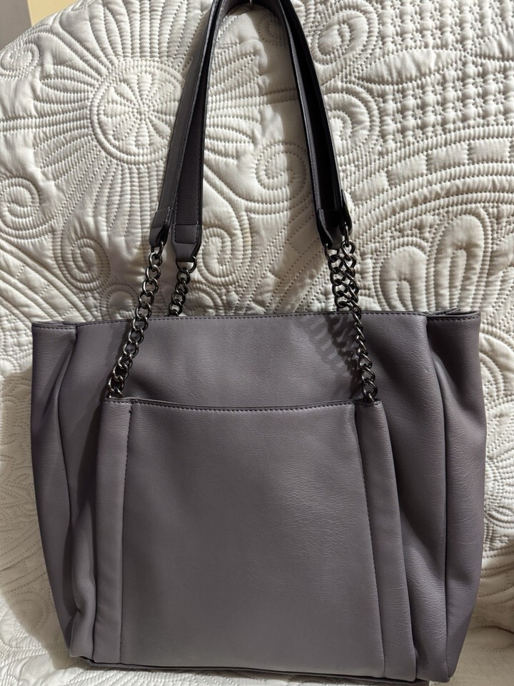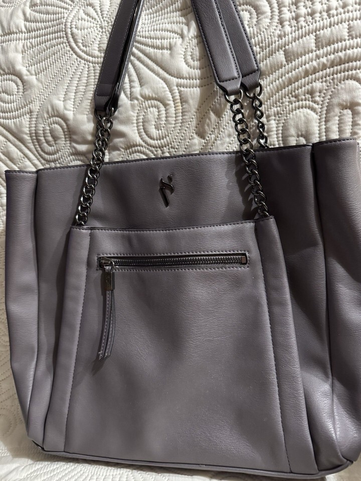 This product is a large women's tote bag in a solid plum color made of faux leather with silver hardware accents. It features double handles, a zipper closure, and inner pockets for organization. The exterior fabric is PU with polyester lining . This tote is perfect for everyday use and can carry all your essentials in style.