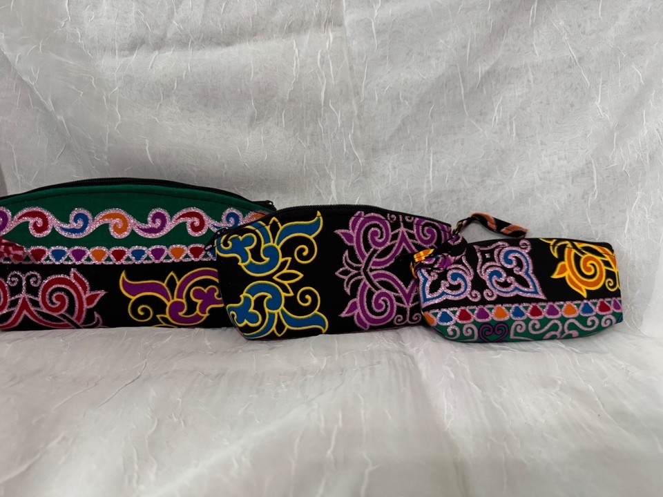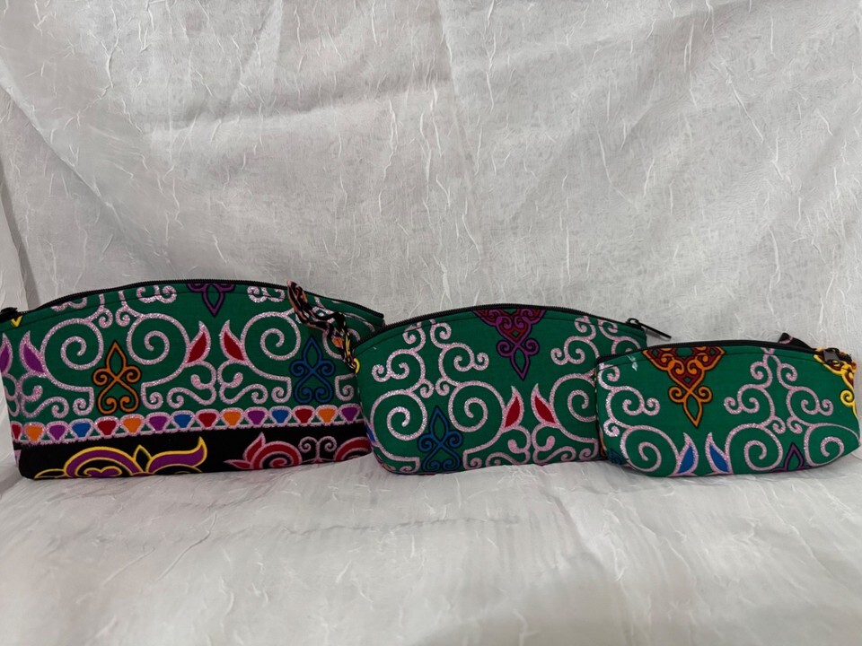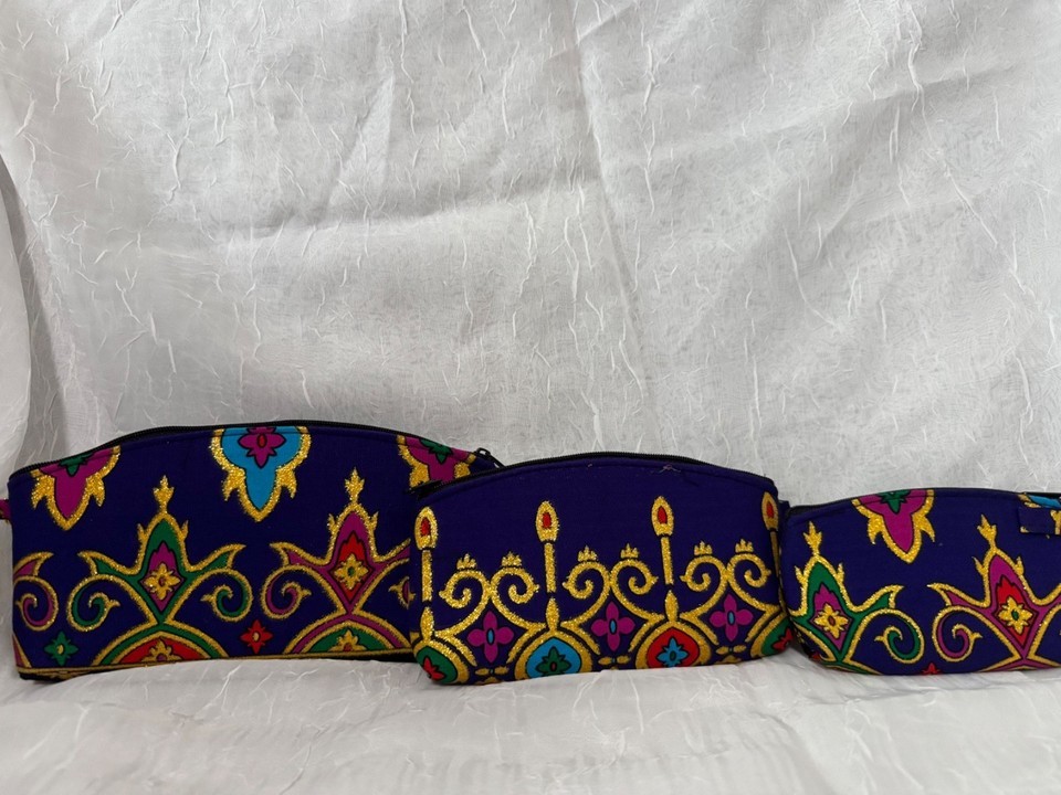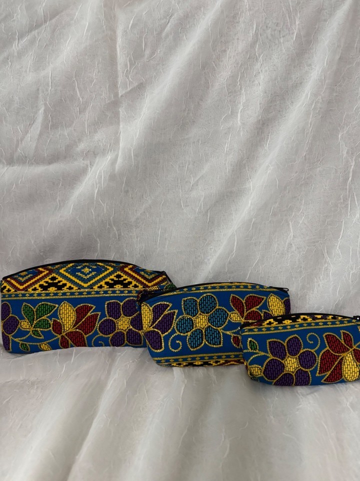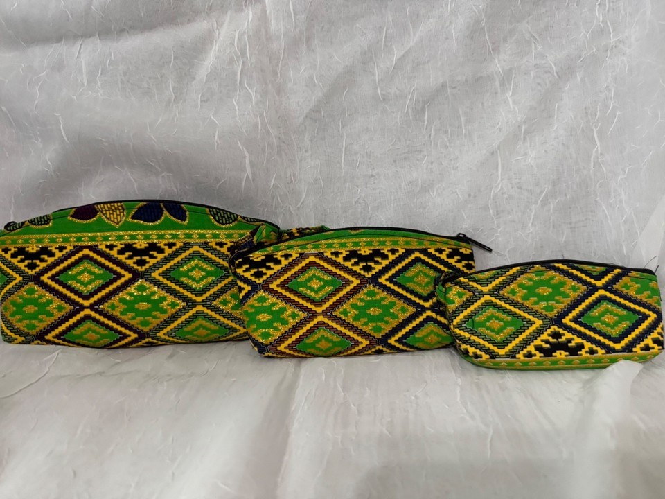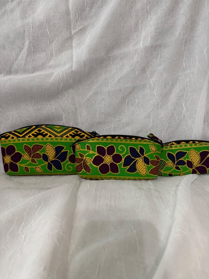 The pouch bag for women is a stylish clutch made from a comfortable cotton blend exterior in a multicolor design. The black lining adds a sleek touch to the overall look, making it a versatile accessory for any outfit. Perfect for carrying essentials while on the go and for kind?s school supplies. ThIs is a 3 set pouch made from Batik fabric.