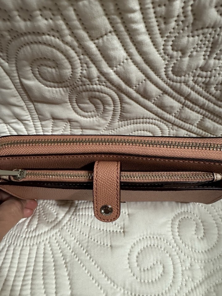 The Coach Women's Leather Wallet in pink coral color features a solid pattern with credit card accents and a zip-around style. Made of leather with a canvas fabric type, this one-size wallet showcases the iconic Coach logo as its theme. Perfect for women looking for a stylish yet practical accessory to store their credit cards and cash securely.