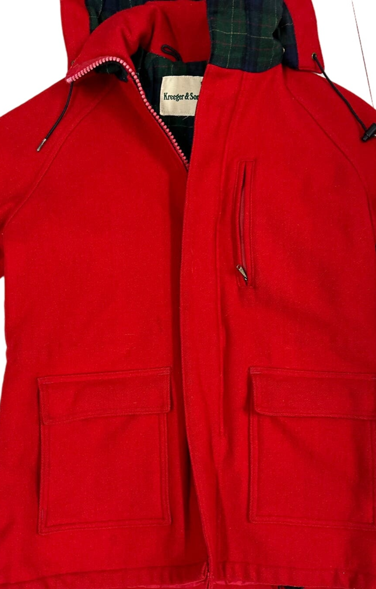Kreeger Sons produced quality outerwear during the 1970s?80s, with influences from New England prep and mod utilitarian styles. This coat?s bright cherry red wool paired with tartan lining is emblematic of collegiate winter fashion of the era.