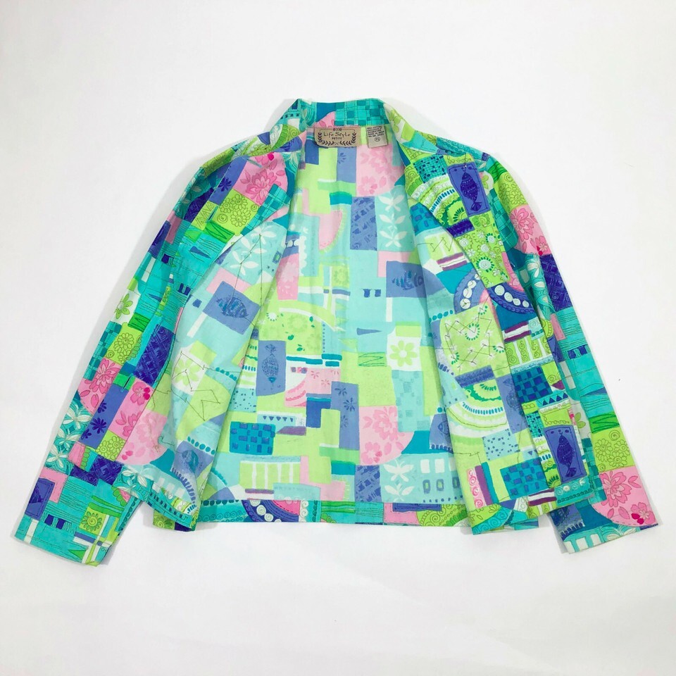This fun colorful print jacket has a geometric design that also has fish and flowers. The jacket has sequins scattered in a random pattern. Medium white buttons close the jacket. There are some missing sequins, really not that noticeable. Pastel colors of green, turquoise, and pink are accented with some darker blues. A great weight jacket for spring or summer.