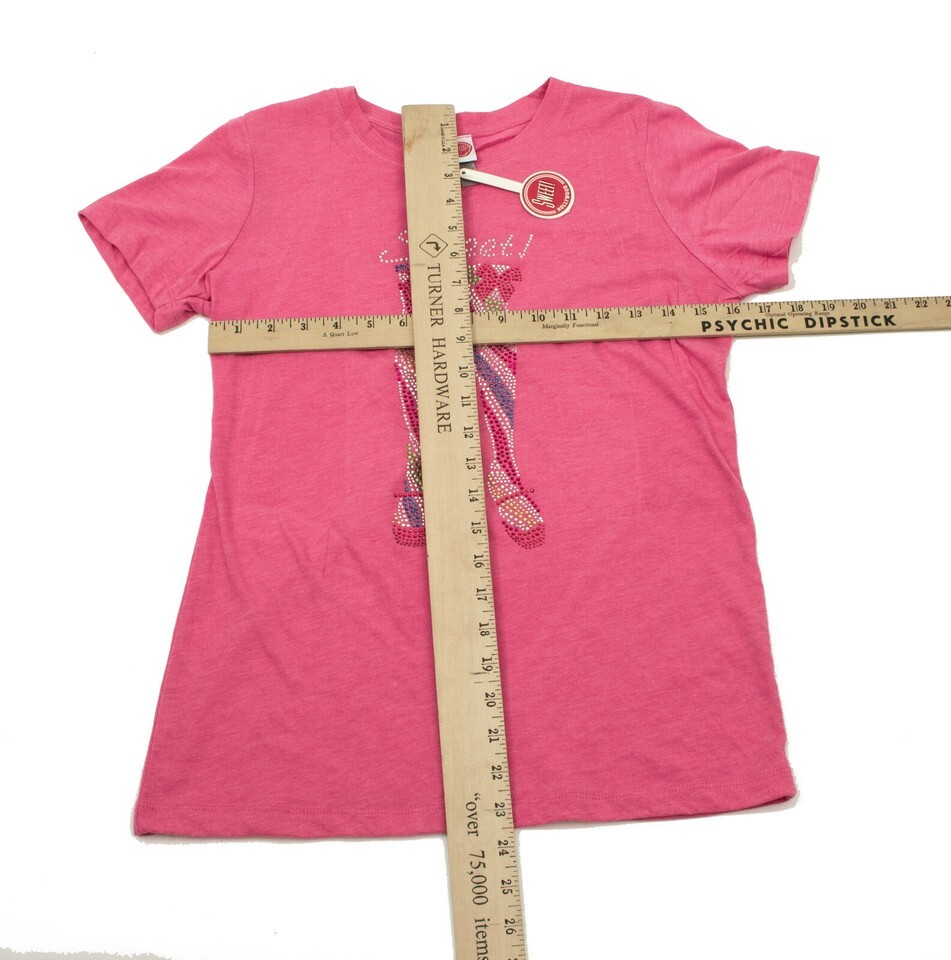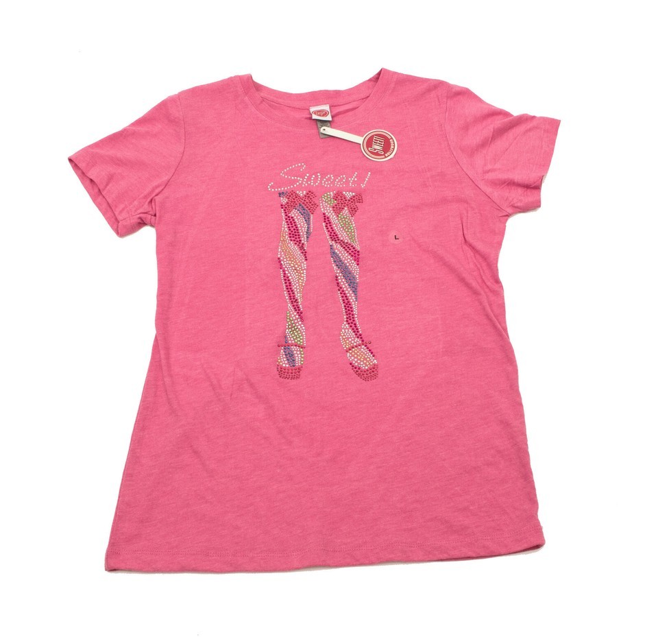 Fun and sassy pink T-Shirt with the work sweet in silver sequins across the top. Beneath that are legs done in multicolored sequins.