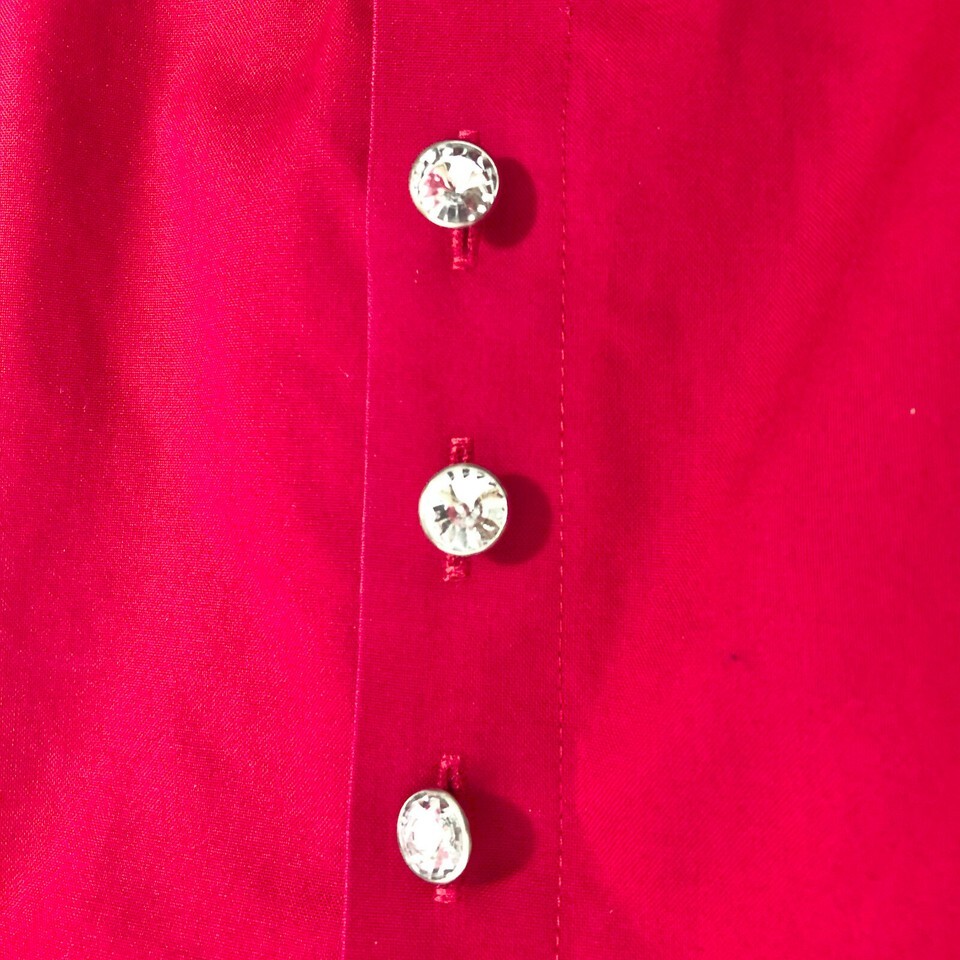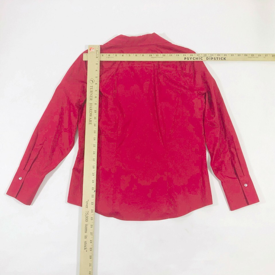 EUC, Excellent Used Condition. Chico's sophisticated red no iron long sleeves button front is perfect for a party or anytime you want a dress up your pants, jeans, or skirt. It has 3 rhinestone buttons down the front and a hidden palcket. Long sleeves end in pretty cuffs that button with a rhinestone. Seams in front back make for a nice fit. No rips, tears or stains.