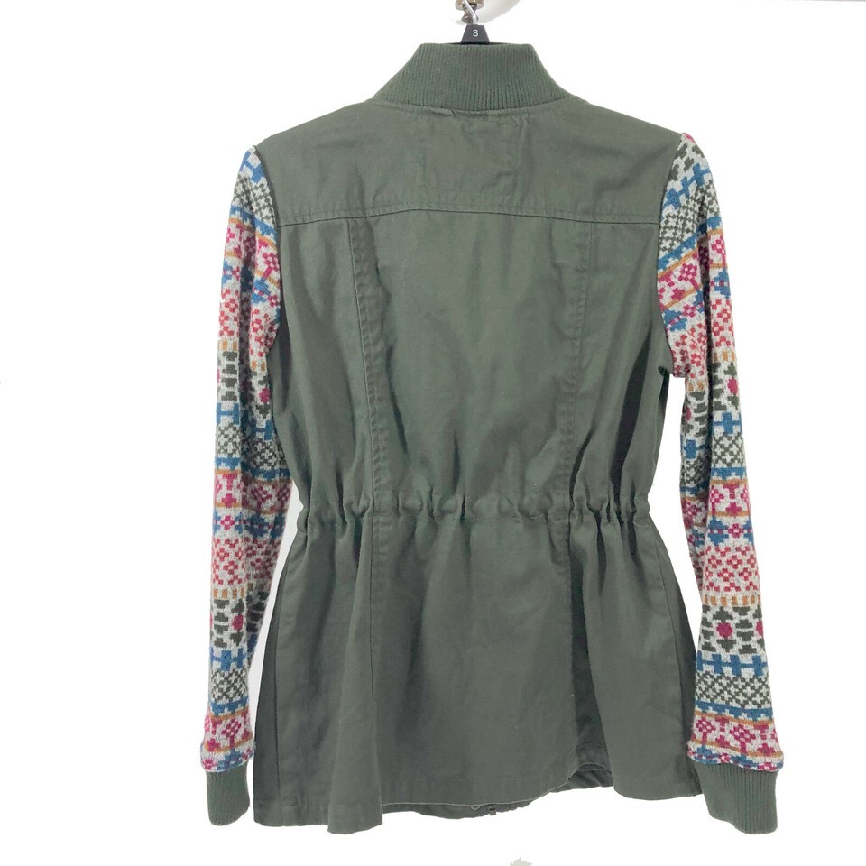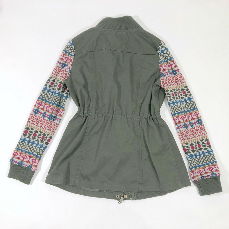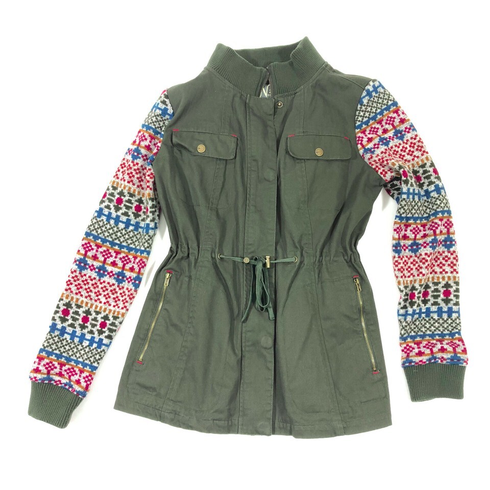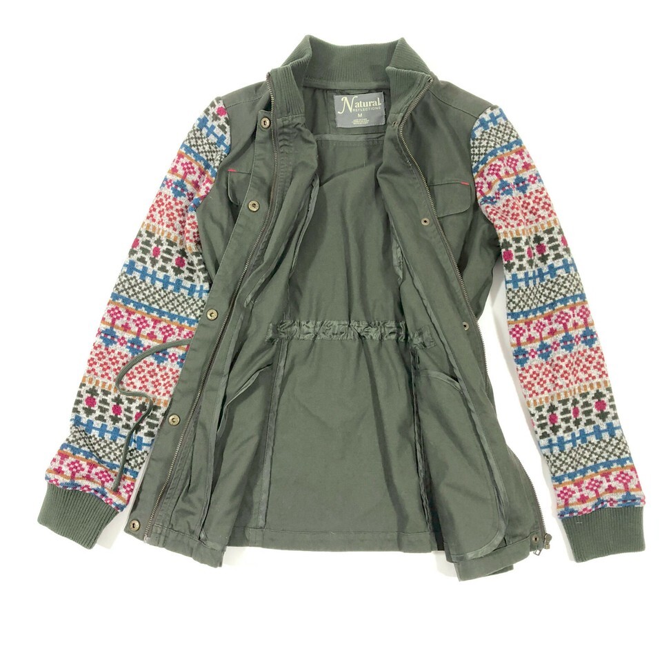 EUC, Natural Reflections olive green jacket with multi color sweater sleeves is perfect for everyday casual wear. Waist is adjustable. Closes with snaps and zipper. Great look for fall and winter.