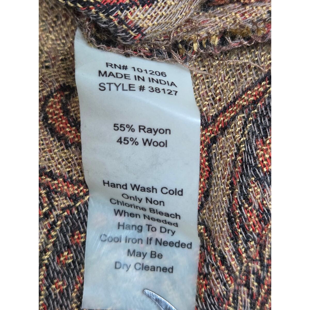 Style #38127, made in India, 55% Rayon / 45% Wool ? a fabric composition used in the brand?s early production runs.