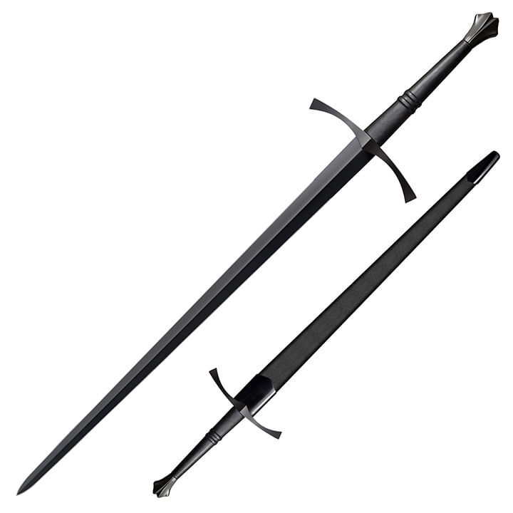 The Man at Arms was a warrior, pure and simple. A stalwart and dependable fighter who exhibited great martial prowess with a range of weapons. He was a capable and competent warrior who was the veteran of many conflicts and was often first into the fray. Although he was not a Knight, he fought and trained alongside them as a brother in arms. To honor these rugged, reliable, salt-of-the-earth warriors we have created a range of true journeyman's weapons that we have called the Man at Arms Collection. Historically, the Long Sword featured a distinctive cruciform hilt and a long, double edged blade that was equally adept at opposing both light and heavily armored foes. Its extra-long blade offered the reach and leverage for powerful stabbing, cutting and chopping strokes while its long cross guard and heavy pommel were useful for hooking, striking and smashing. When heavy plate armor was encountered, strikes with the edge were often abandoned in favor of a quote;Half-Swording quote; technique; where one hand grips the hilt and the other the blade for grappling and in-fighting - to better direct the point in powerful jabs, and to accurately thrust at the small gaps and joints in a suit of armor. Cold Steel's Italian Long Sword is designed so that the blade and balance slightly favor the thrust, while still being capable of delivering astonishingly effective cuts. It features a simple cruciform hilt, long upturned cross guard, leather-over-wood grip, and a heavy counter-balancing fish tail pommel.