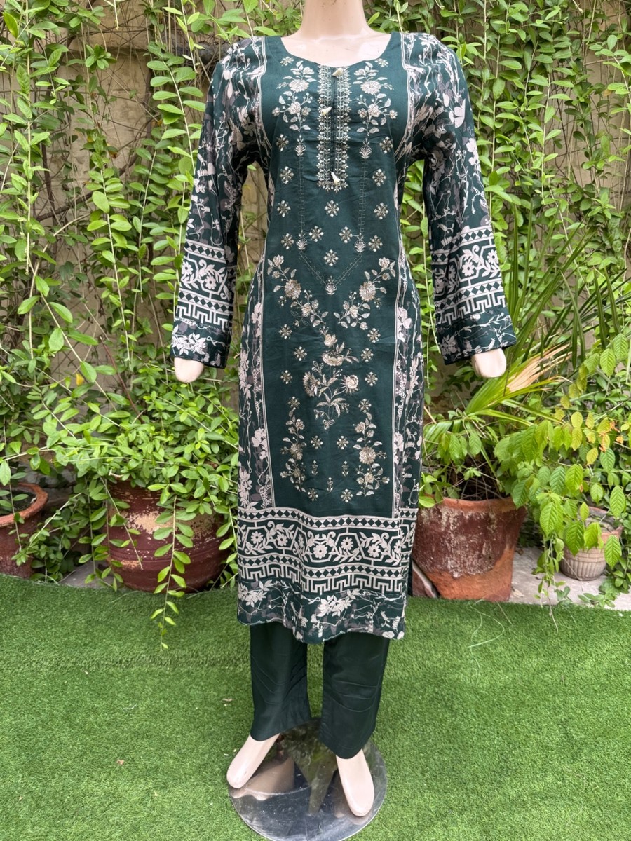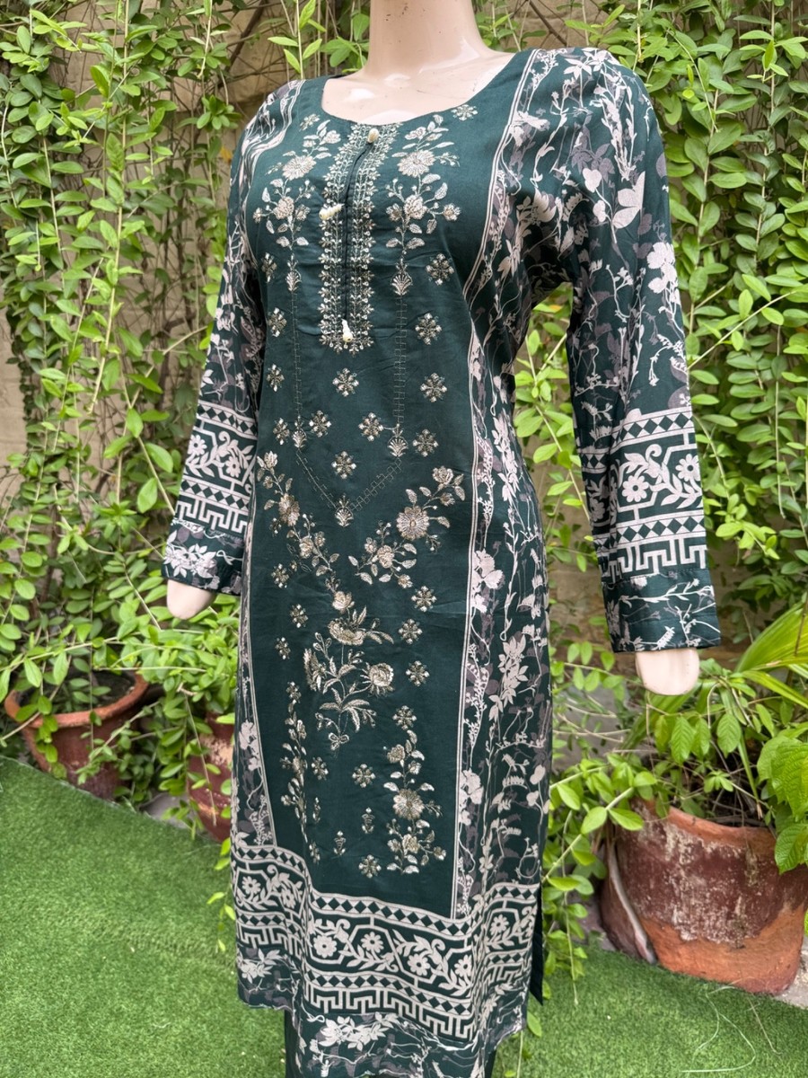 Pakistani Dark Green Printed Straight Shirt 3PCS Lawn Suit w/ Threadwork ,XL #2
