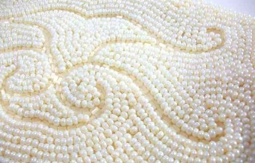 Beautiful heavy white glass beads, plain on one side, flowing motifs on the other. The front also has champagne bugle beads inside the motifs. It has a zip top, and inside its lined with white satin, and has a label " Debbie ". It seems to have never been used- and would make a lovely wedding purse!