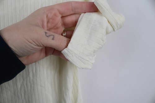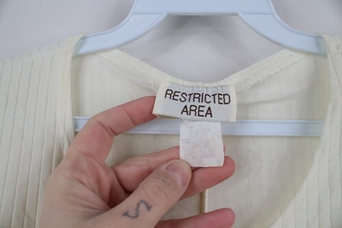 Loose threads arms. Sheer fabric. Yellowed. Made in USA