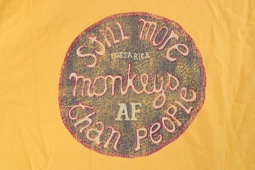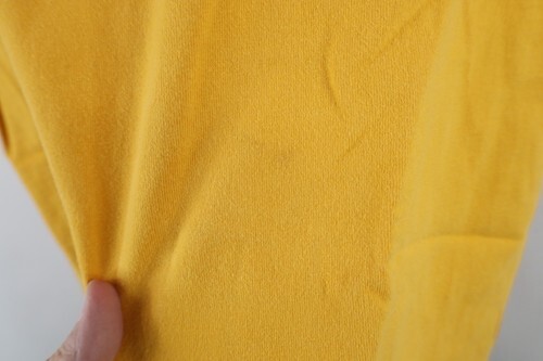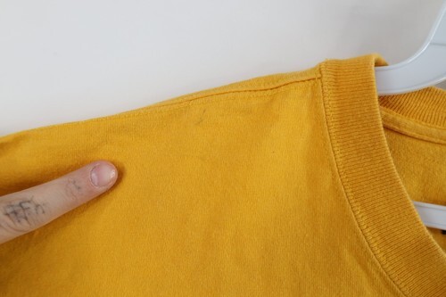 Stains front, right shoulder. Loose threads back top. Graphics faded. Color faded. Made in USA