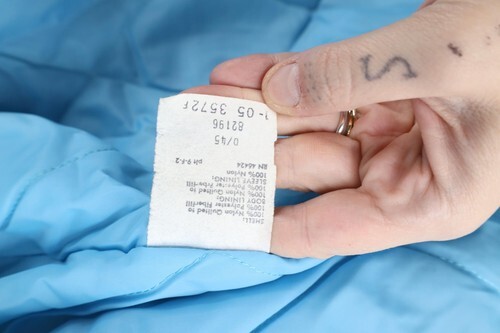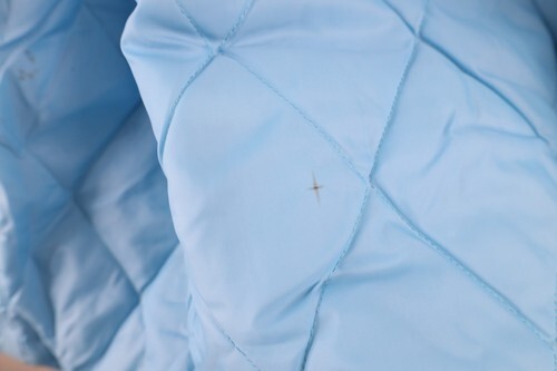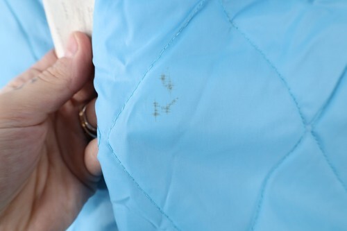 Stains front, collar. Collar, shoulders, cuffs discolored. Inner lining stained. Color faded. Inner pockets blemished. USA made