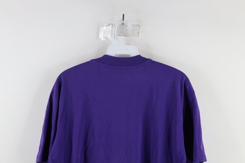 Blemishes on collar, front top. Bleach stain back bottom. Graphics cracking and faded. Color faded. USA made
