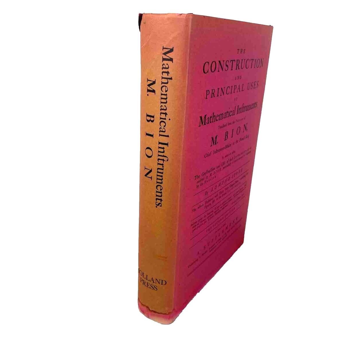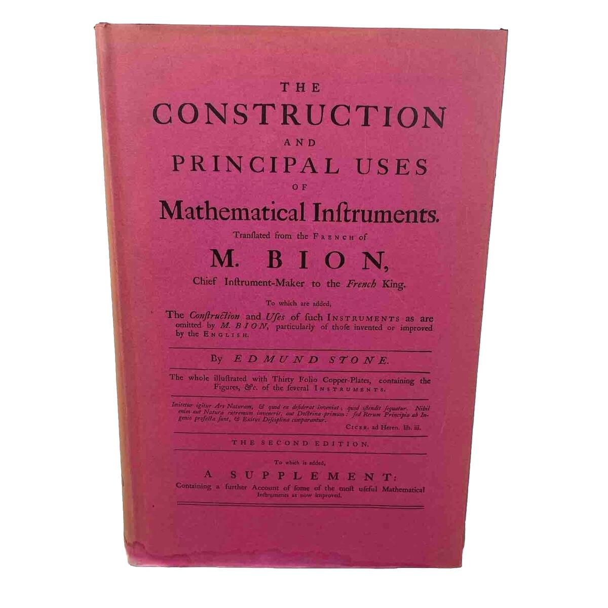 1522. Construction and Principal Uses of Mathematical Instruments 1972 M. Bion Reprint. Translated from the original French. Originally published in 1758. Reprinted in 1972. Only 500 copies were printed. The dust cover has water damage on the edges and is stuck to the book.
