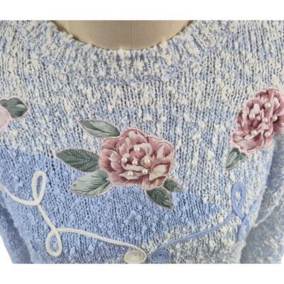 80s Vtg Needles & Yarn Grandma Acrylic Sweater Blue Rose Applique/Pearl 3D M