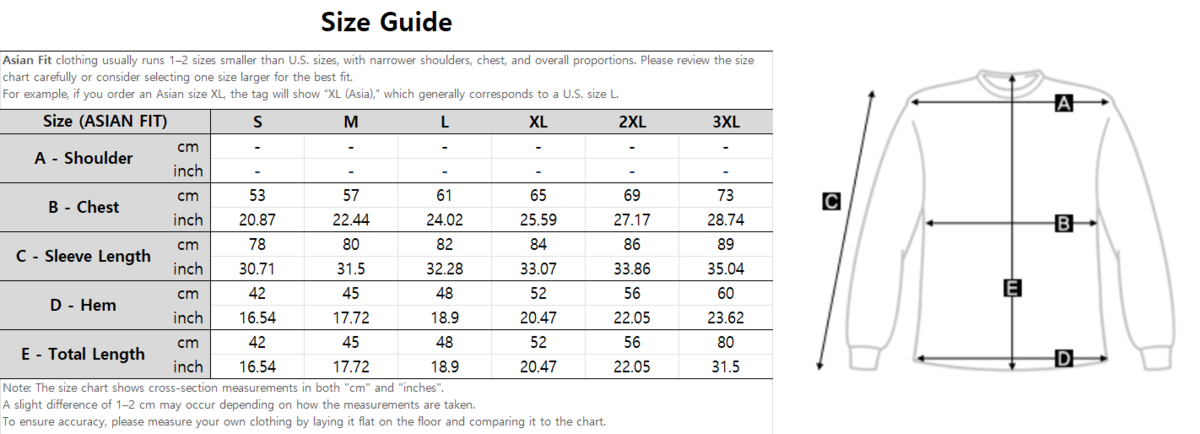 Asian Fit refers to clothing tailored for body shapes commonly found in Asian populations. These items typically run 1-2 sizes smaller than U.S. sizes, with narrower shoulders, chest, and overall proportions. Please check the size chart carefully or consider sizing up for the best fit.