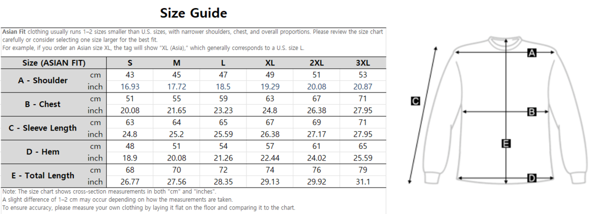 Asian Fit refers to clothing tailored for body shapes commonly found in Asian populations. These items typically run 1-2 sizes smaller than U.S. sizes, with narrower shoulders, chest, and overall proportions. Please check the size chart carefully or consider sizing up for the best fit.