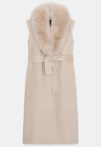 Waistcoat ecru made from a wool-blend knit. Lapel collar with detachable faux fur trim. Sleeveless design. Side welt pockets. Adjustable self-tie belt in the same fabric. Straight hem.
