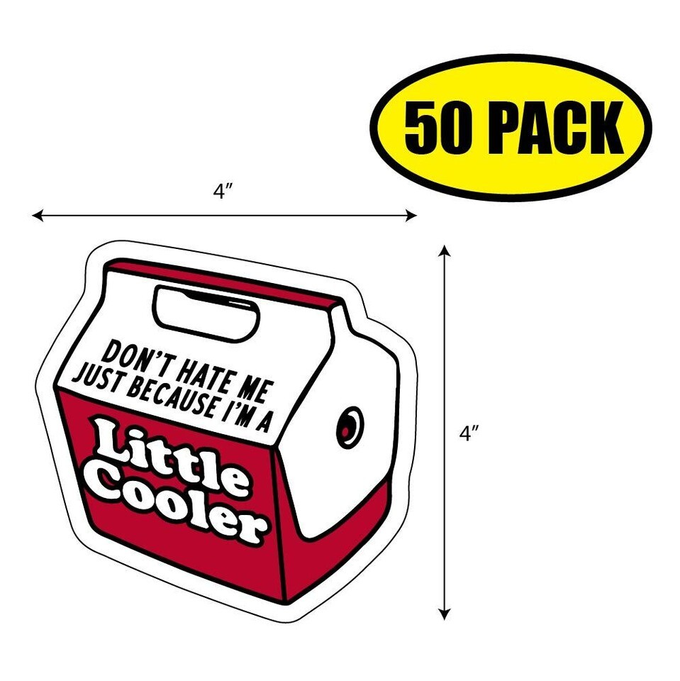This listing is for a 50 pack of 4" x 4" 'Don't Hate Me Because I'm a Little Cooler' decals.