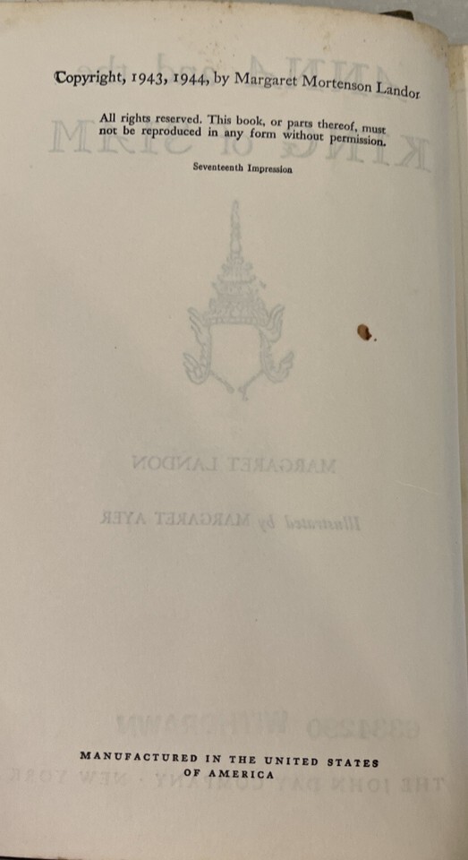 1944 Anna and the King of Siam by Margaret Landon Hardcover 17th Impression.