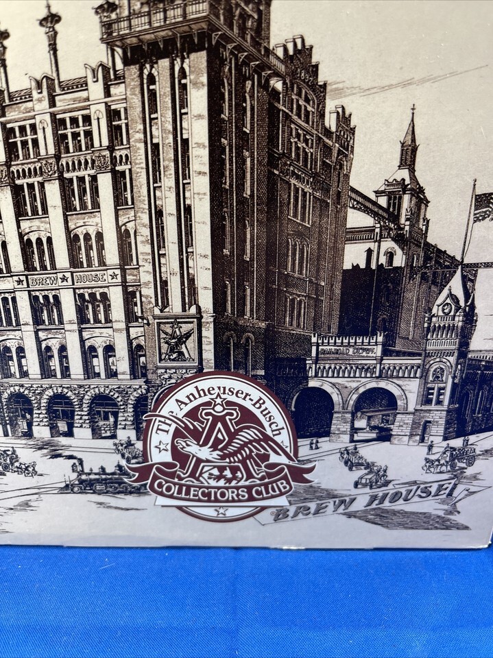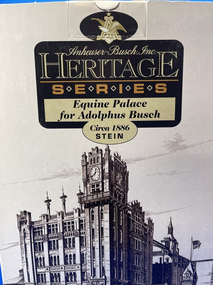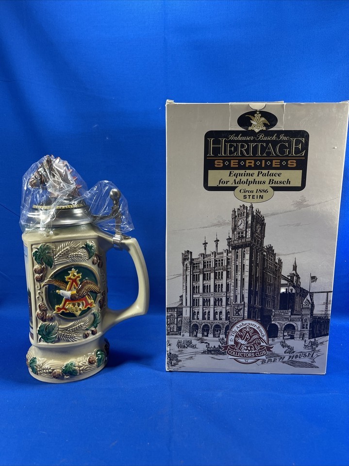 - Equine Palace for Adolphus Busch Stein is the fourth and final edition from the Heritage Series by Anheuser-Busch commemorates the housing for what were some of the hardest working members of the 19th Century Anheuser-Busch staff; the horses owned by Founder Adolphus Busch. The stein showcases a full color reproduction of a vintage illustration of what is now the famous Clydesdale Stable. The vintage illustration displays the impressive towers, extravagant stained glass windows, wrought iron and impressive stone work. Atop the steins's pewter lid is a detailed hand-painted ceramic bust of a majestic World Famous Budweiser Clydesdale. The stein's signatures of authenticity are the limited edition stein number and the official Anheuser-Busch series stamp, both on the bottom of the stein. Original box, certificate of authenticity.