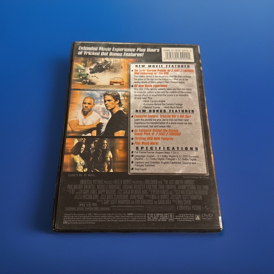 Get ready for a high-octane adventure with "The Fast and the Furious" on DVD! This 2003 action and adventure movie, directed by Rob Cohen and starring Paul Walker and Vin Diesel, is sure to keep you on the edge of your seat. With a rating of PG-13, it's a great choice for a family movie night.