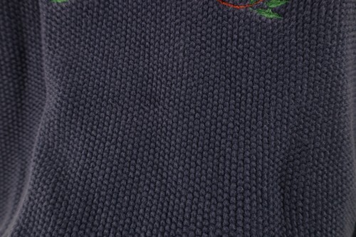 Blemishes/dark spots front. Loose threads tag. Design distressed. Collar, cuffs discolored. Color faded. Pilling. Made in USA