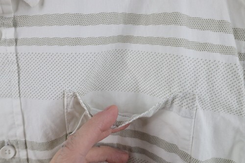 Stains front. Collar, arms discolored. Yellowed