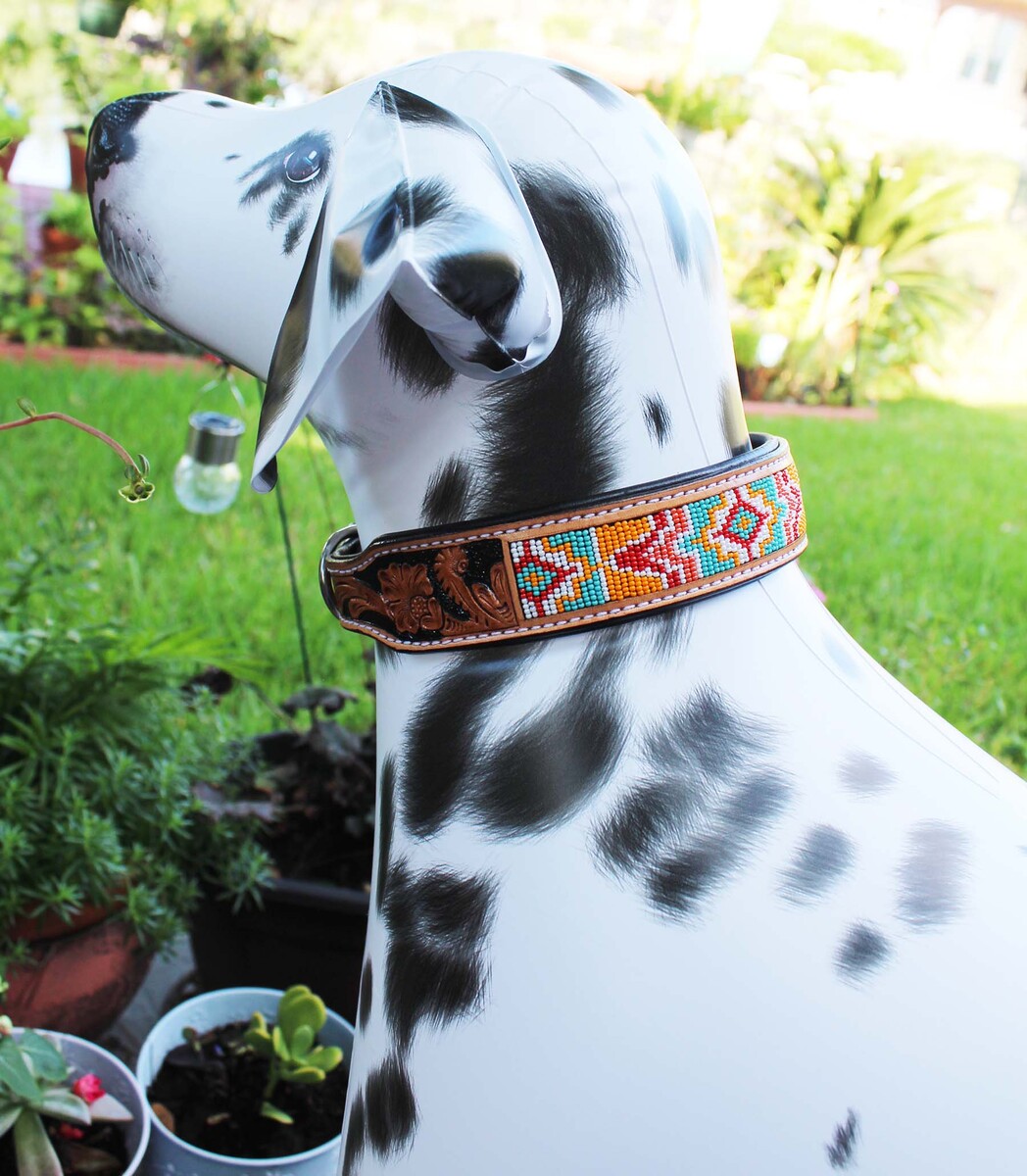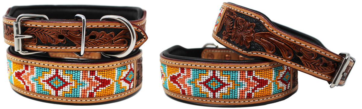 Hand Tooled Beaded Padded Leather Dog Collar 60164