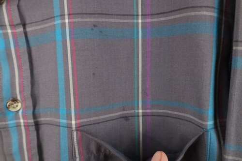 Holes, blemishes front. Broken button right cuff. Sun faded. Loose threads buttons. Collar, cuffs discolored. Color faded. Pilling