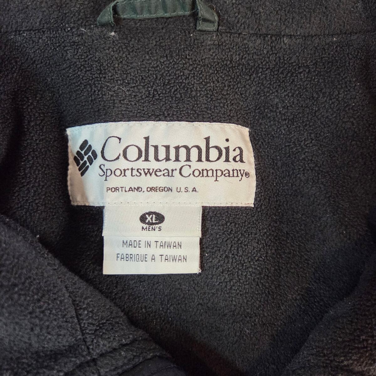 Classic Columbia Sportswear men?s bomber-style jacket from the early 2000s, made in Taiwan. Features a durable green nylon shell with soft black fleece lining, ribbed cuffs and hem, and a full-zip front closure. Elastic hem and cuffs provide a secure fit while keeping out the cold.