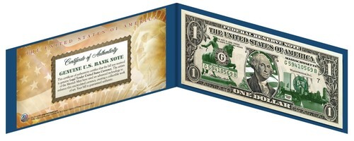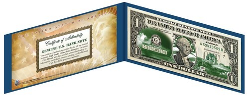 This NEW JERSEY State uncirculated One-Dollar Bill is Genuine Legal Tender of the United States, which has been enhanced with beautiful iconic images of the State. The green-and-white colorized images are accomplished through a revolutionary new authentic genuine colorization process pioneered by The Merrick Mint, creating a collectible work of art. Included is a blue display portfolio plus a Certificate of Authenticity to guaranty that your bill is authentic and recognized by every monetary authority around the world, and assuring its Collector Edition status. Only genuine Legal Tender $1 United States Bills are used for this unique colorization process. Each $1 Bill is in FRESH, CRISP, UNCIRCULATED condition, and was directly removed from untouched wrapped Federal Reserve sealed packs. The first U.S. President, George Washington , is featured on the obverse, along with the special colorization overlay. The Great Seal of the United States is featured on the reverse.