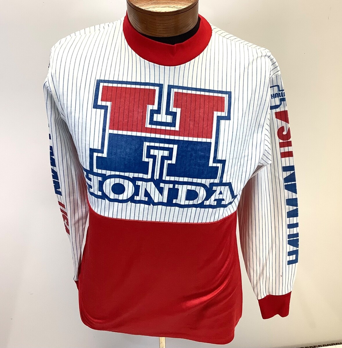 Vtg 70/80s Hallman Racing USA Honda Racing Jersey Shirt Motocross Long Sleeve Lg. How neat is this vintage Honda jersey made in the USA by Hollman Racing of California! It is an adult size large. Overall really nice condition for its age. I do see a couple of very small spots that I did not try to get out. Please see all photos. Photos include measurements for armpit to armpit and for top of shoulder to bottom of jersey.