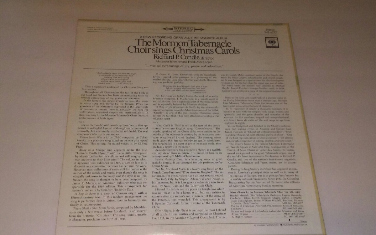 THE MORMON TABERNACLE CHOIR SINGS CHRISTMAS CAROLS VINYL LP RICHARD P. CONDIE EX