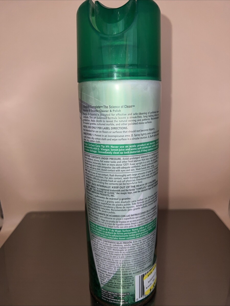 Magic Complete Specialty Surface Cleaner for marble and granite delivers a streak-free clean and a high gloss shine on all polished stone surfaces. This can contains 17 ounces (1 lb 1 oz or 482g) of product.