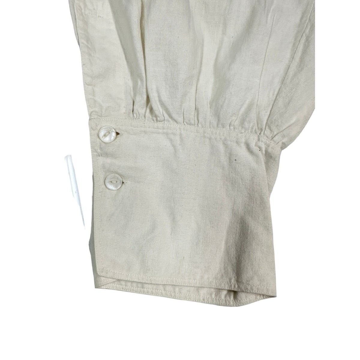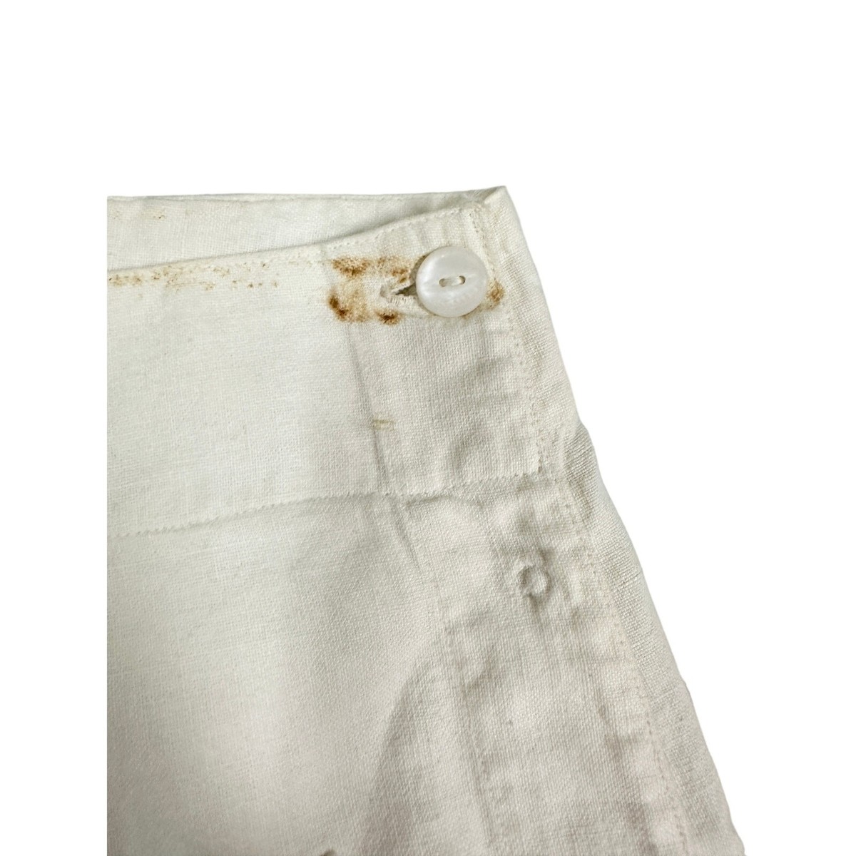 Condition: Excellent for age. Only flaw is a rust-colored stain at the top front button (as shown); otherwise, the linen is strong, clean, and fully wearable.