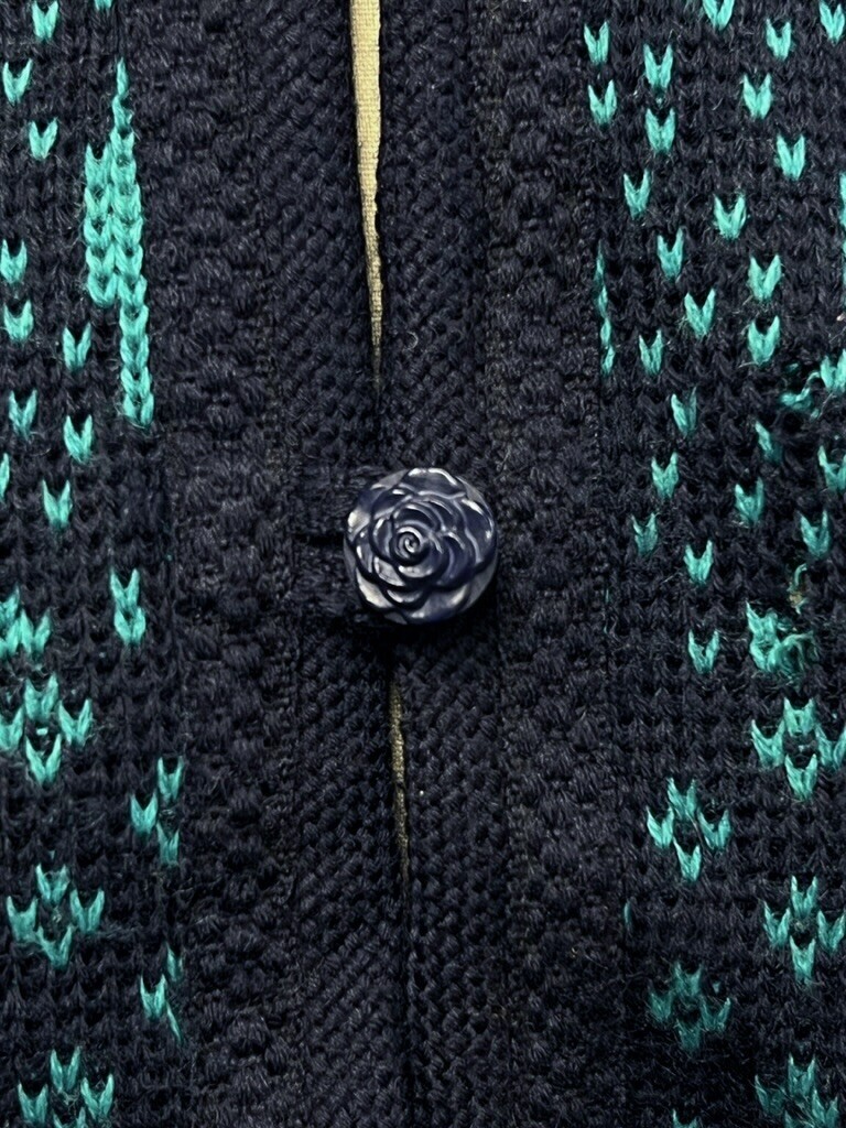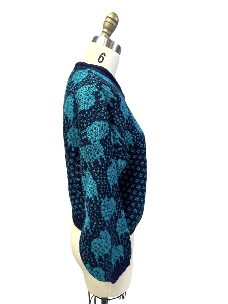 This vintage Halling Norway wool cardigan is shear-ly delightful! Sporting a classic sheep intarsia design in a lovely blue hue. The real star? Those cute blue floral buttons with loop closures! Size Large. Ready to add some whimsical warmth to your wardrobe. Excellent clean condition, seems not worn.