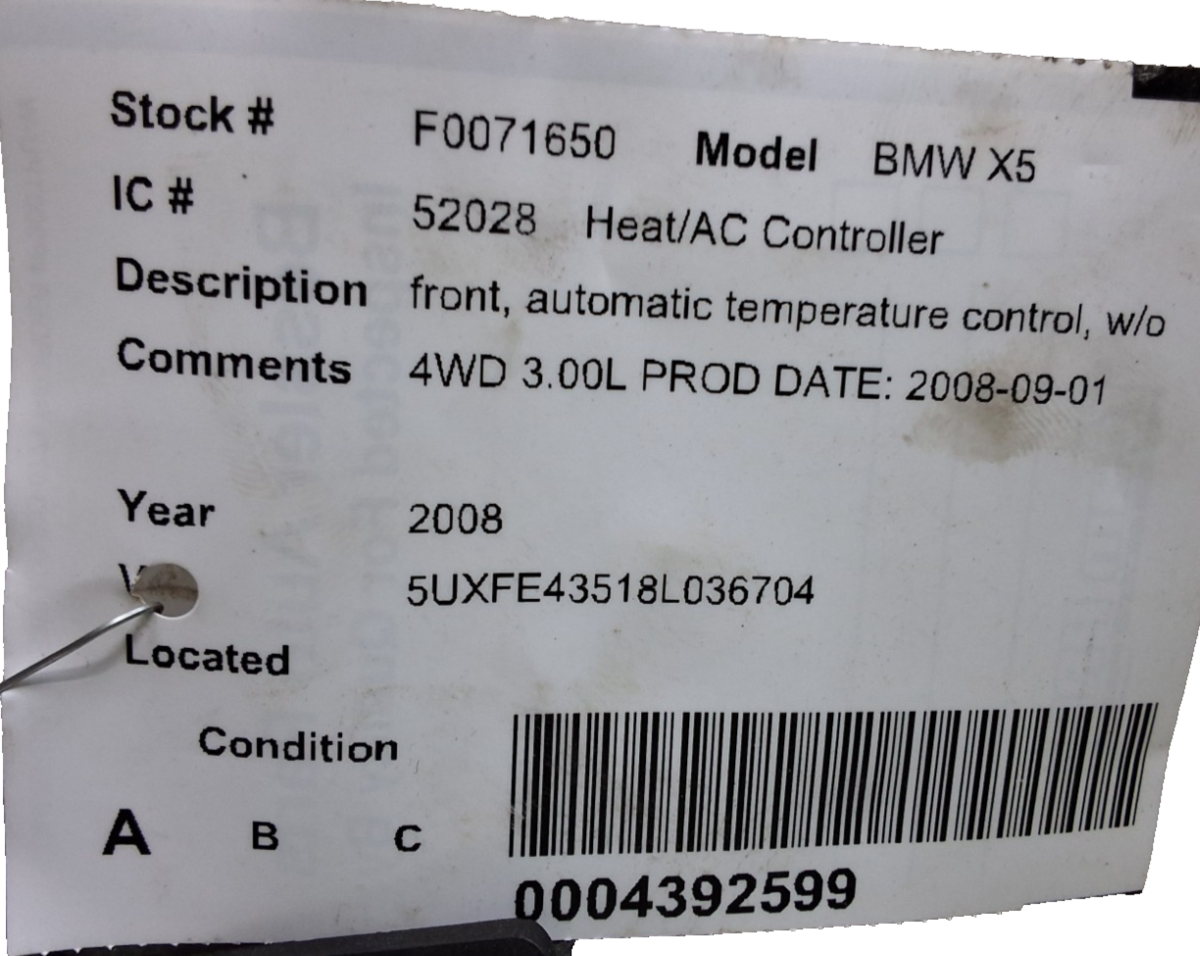 2007 through 2013 BMW X5 automatic heater AC control for vehicles with heated seats.