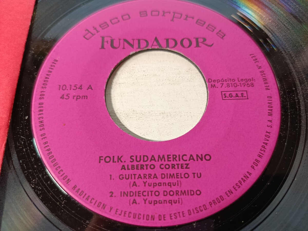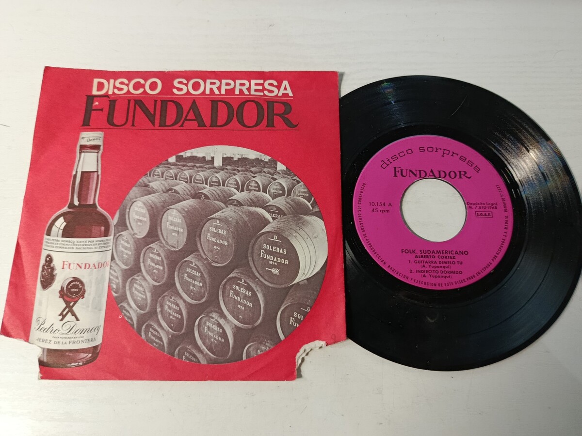 Alberto Cortez, South American Folk, Disco Sorpresa Fundador, Hispavox, 1968, 7 inch vinyl , promotional single, Atahualpa Yupanqui, Argentine music, Latin American folklore , Pedro Domecq, Fundador Domecq, vintage advertising,vinyl old, retro collection, Spanish vinyl, collector rarity, Alberto Cortez single, dรญmelo tรบ guitar, Indiecito dormido,los axlesde my cart, It's getting light, traditional music, Fundador Jerez, promotional edition