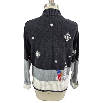 90s Dressbarn Fuzzy Knit Sweater - Snowman & Snowflakes Zip Front S