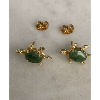 CUTE 14K YELLOW GOLD AND GREEN JADE TURTLE STUD EARRINGS SKY