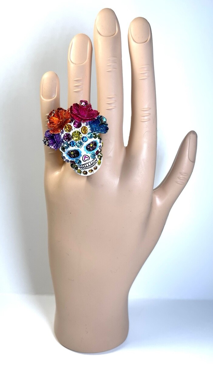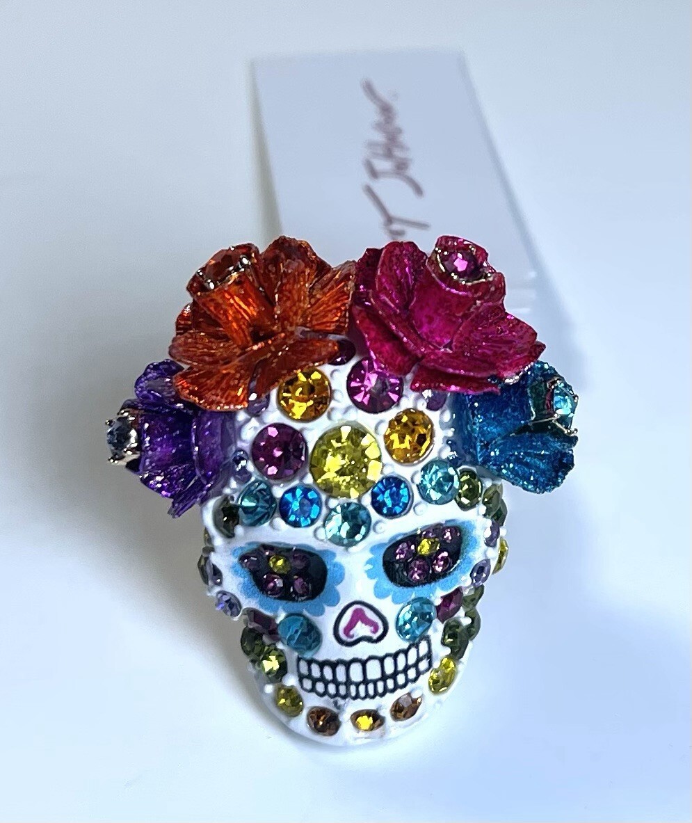 NWT $58 BETSEY JOHNSON White Gold Multicolor Skull Flowers Rhinestone Ring