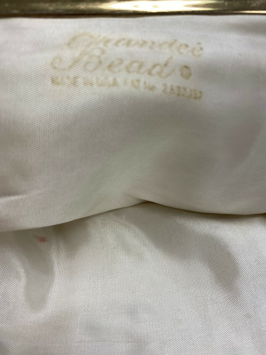 Securing this treasure is a sleek silver-toned metal hinge with a satisfyingly simple "ball clasp" closure. And for effortless carrying, a chic beaded strap/handle is firmly attached to the sturdy metal frame. Peek inside, and you'll find a clean, white faille fabric lining, ready to cradle your essentials.
